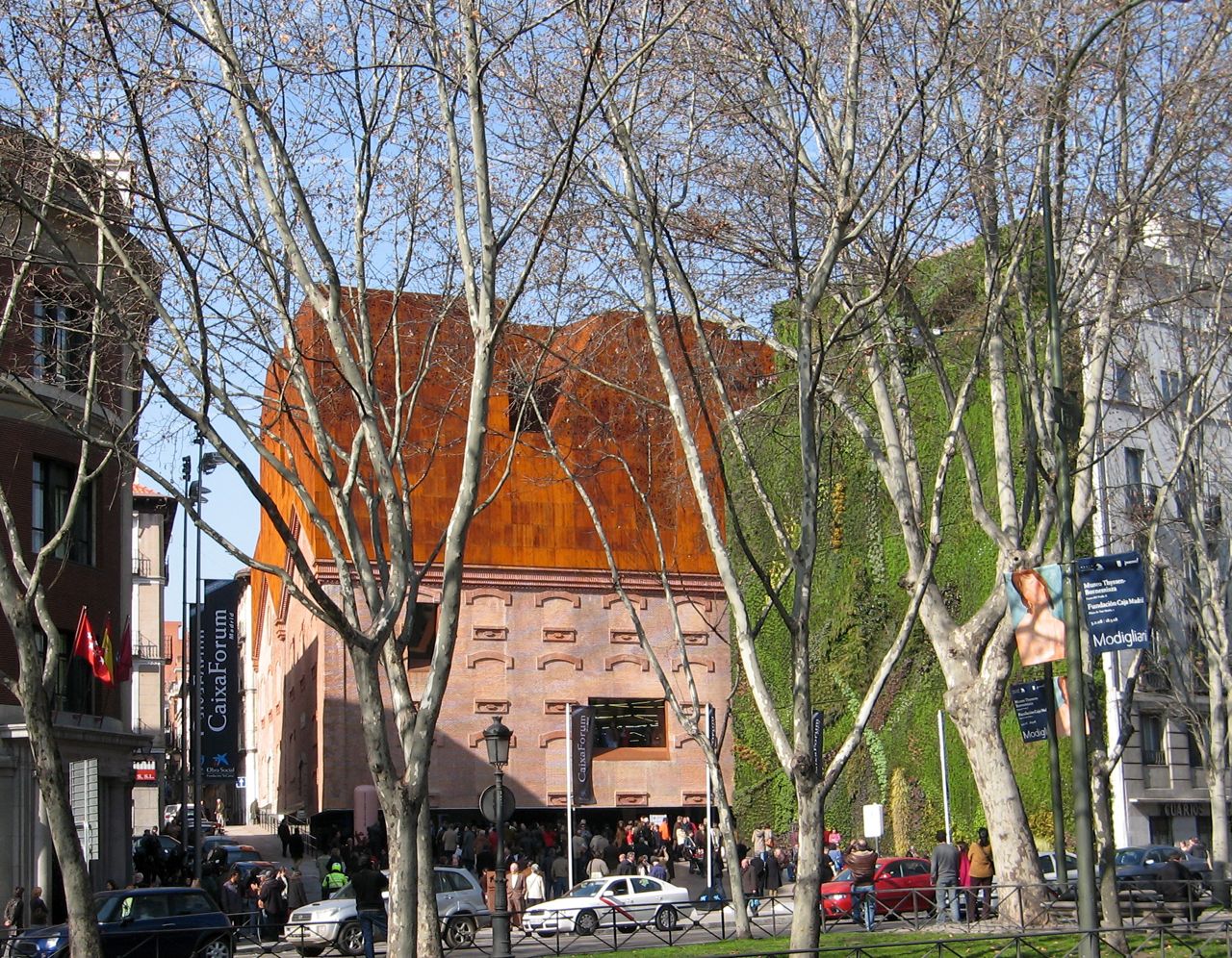 A large sculpture next to a mega monochrome painting – at first glance and from a distance, that’s what the serrated box and vertical garden of the new CaixaForum Madrid resemble. A Per Kirkeby next to an oversize Ad Reinhart or Brice Marden in an unknown green period, or perhaps a public piece by Claes Oldenburg and Coosje van Bruggen.