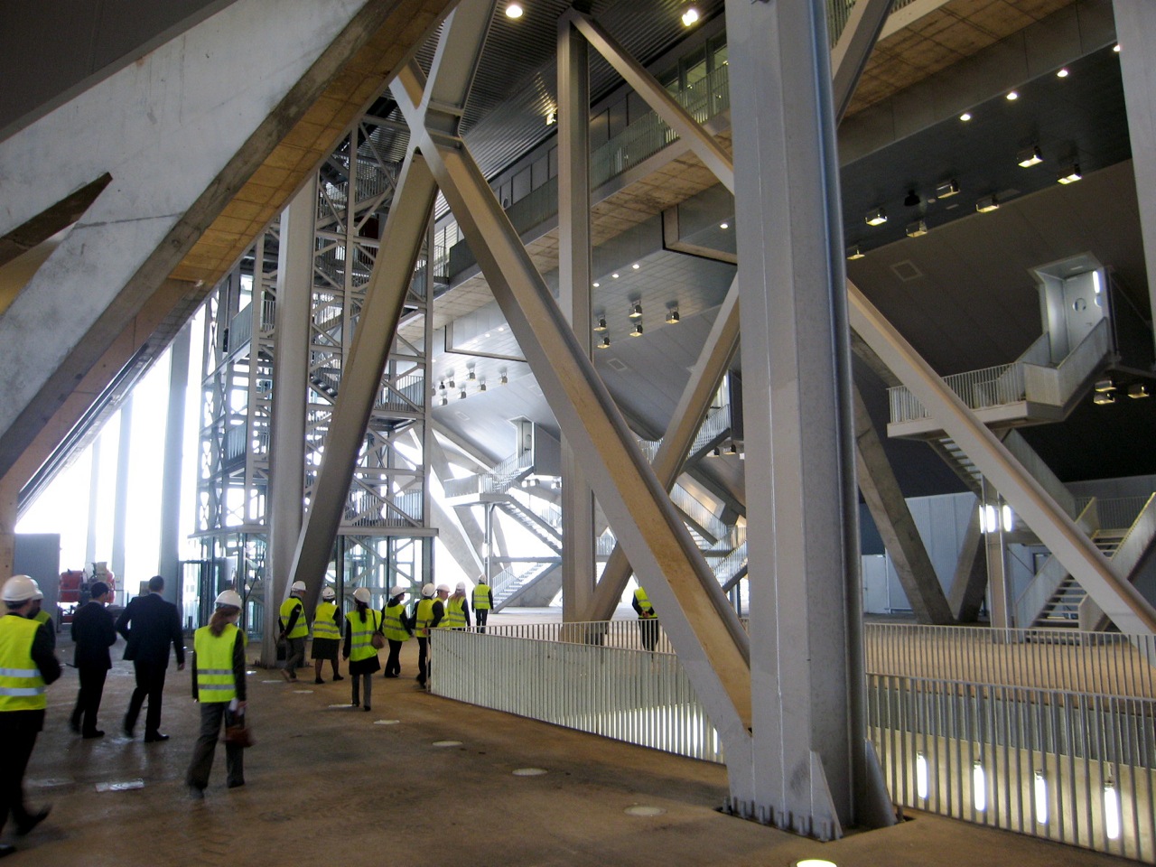 In fact, it is precisely the lightness of the Caja Mágica’s exterior veil – its mysterious translucence as opposed to objective clarity – that situates its architecture far from traditional modernist dogma. The metal mesh that shades and conceals the building’s content, providing only a vague glimpse inside when the building’s interior is illuminated at night, is a key element of this design. The stainless-steel mesh was developed especially for this project in record-sized panels measuring 25 x 7.2 m. Its effect is quite remarkable, generating an element of surprise when the building is entered, for it is only once the exterior metal mesh is penetrated that the characteristic ‘inverted pyramid’ forms of a stadium become apparent. Only now do we know it’s not a warehouse. Even more significantly, the building’s skin, in conjunction with the inverted pyramids, creates a fascinating left-over space in between, which is characterized by dramatic overhangs, angled structural supports, lifts, stairs and bridges: probably one of the closest built approximations to Piranesi’s Carceri to be seen anywhere. Not bad for an entrance lobby.