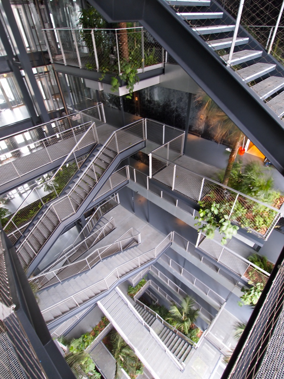 A single staircase climbs up the atrium along a different trajectory at each level change, connecting galleries as well as bridges, platforms, and a over a hundred planter boxes containing ten different varieties of palm trees and other plant species. It is a delirious, seemingly endless space that would make Giovanni Battista Piranesi proud, and which redefines the late-modern hotel atrium made famous by architect-developer John Portman.
