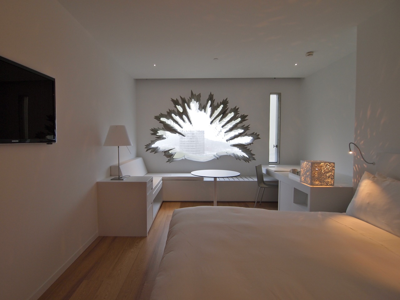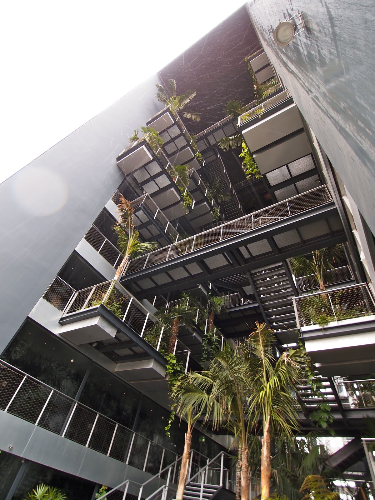Unfortunately, however, the theme of “palm tree” has been taken by its architect just a little too far. The palm tree-shaped windows of most of the rooms are gimmicky and goofy. A gaffe. Those windows are precisely why it’s a good thing the doors of the hotel rooms open directly onto the memorable garden–and city–outside.