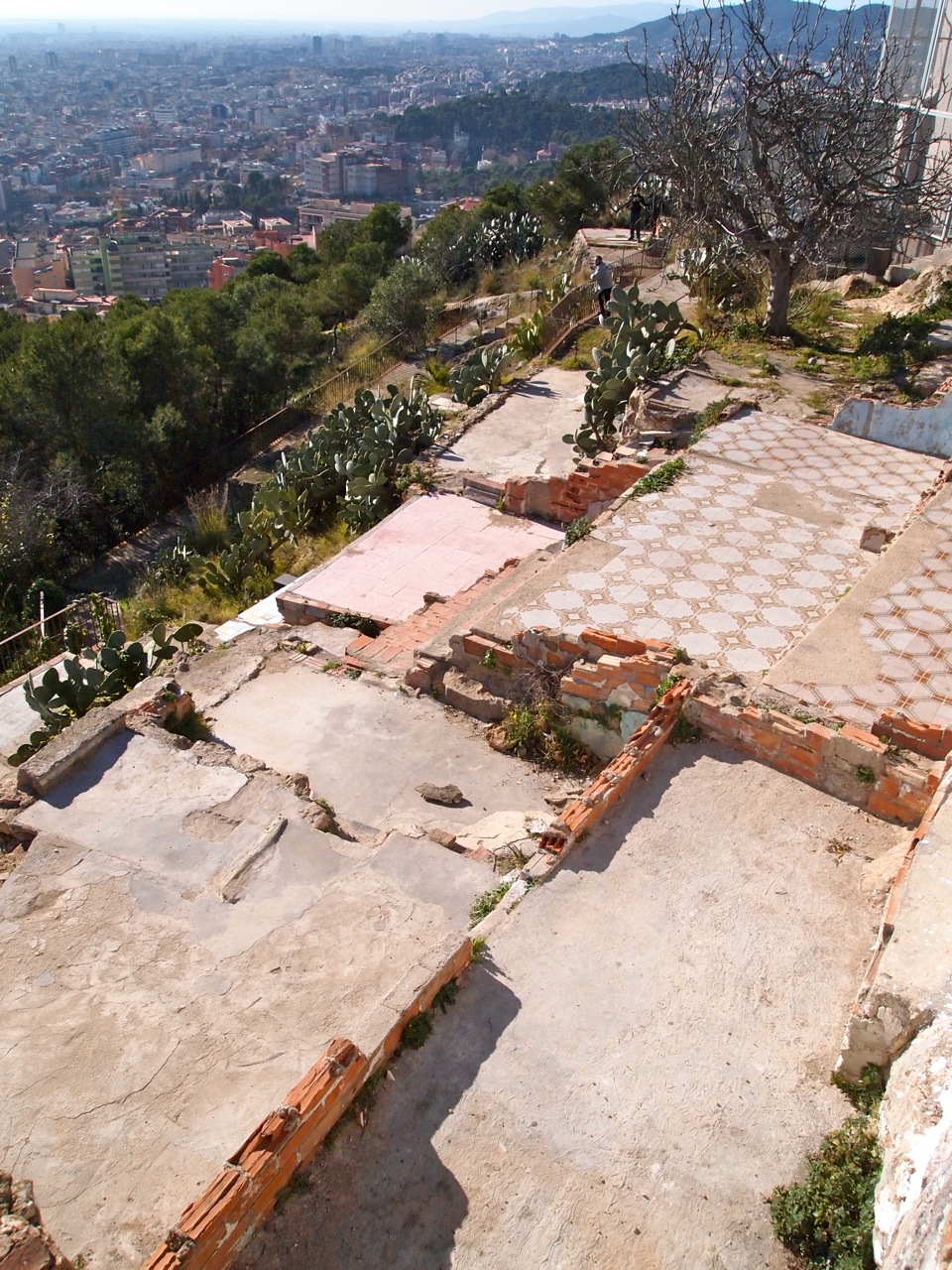 Slowly, however, as I noticed what appeared to be some not-very-ancient ruins of houses abutting the bastions, it became evident that the architectural design-idea of this public space consisted of creative revealing or peeling-away of layers instead of the usual (this being Barcelona) creative construction. Ordinary hollow-core brick wall remnants, concrete steps, and gaudy 1970s floor tiles–remains of the shantytown–together with the restoration of the bastions are the only elements that comprise this project. OK, yeah, the handrails too.