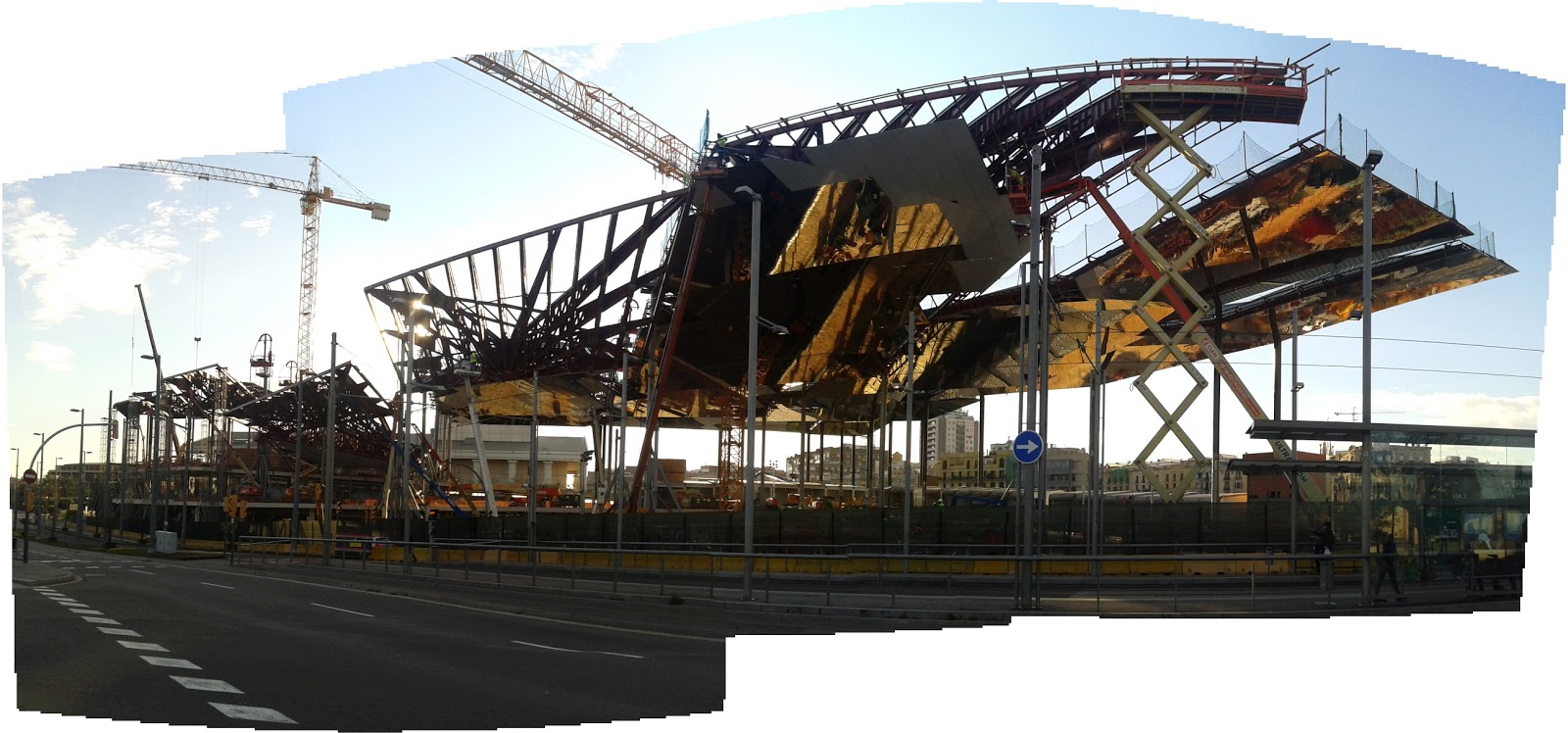 The construction of the new Mercat dels Encants / Fira de Bellcaire (Barcelona’s flea market), by b720 Arquitectos, is not only spectacular but also quite unusual, as it is being built completely without scaffolding. Large sections of the building are first fabricated on the ground before being elevated and fastened into place, a process similar to the way the nearby MediaTIC building by Cloud 9 was erected. However, there is a marked difference here: the columns along which the market’s roof segments slide up are incredibly slender, looking as though they might collapse at any moment under the loads they support. In the end, it is of course the very roof structure that will finally provide lateral stability to the building. But until that moment, this site remains an unnerving sight.