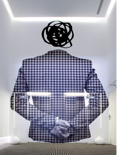 For Pau, its new hotel in Barcelona, the Room Mate group sought an interior that would conjure an archetypal character. Luckily, architect Teresa Sapey likes to tell stories in her designs. “In this case, Pau is a Catalan gentleman; a chef who is refined and edgy at a time when Catalan cuisine leads the world,” she explains. Through graphics and furnishings, she shows Pau moving through a sequence of spaces that form chapters of sorts. The most dramatic, the elevator lobby, introduces the protagonist, represented in a large artwork stenciled onto the elevator doors and walls. Wearing a jacket with the same houndstooth pattern as the carpet, Pau has his back turned to us, and his head appears to be in a knot. “I have always liked houndstooth for the classicism of its directional black and white checkerboard pattern,” says Sapey. “And the irony of a cook wearing pata de gallo! (In Spanish, houndstooth translates as “rooster leg.”) The question might be whether the rooster came before the chef.”