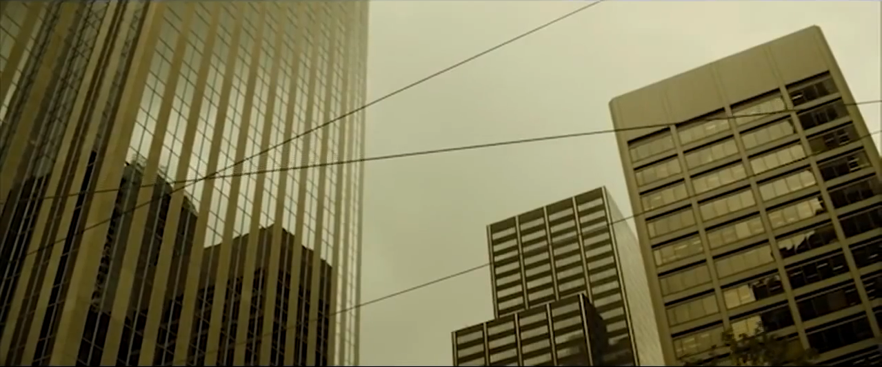 The major role played by modernist architecture in Enemy inevitably invites comparison with Jaques Tati’s Playtime, even though these films are separated by over half a century of time as well as an ocean of distance, not to mention that Playtime is comical while Enemy is a creepy psycho-thriller. Like Enemy, Playtime’s architecture is exclusively modernist, yet in both cases fleeting appearances by monuments –in Playtime the Eiffel Tower makes a brief appearance as a reflection in a glass door — serve to situate the story in a real place. Another remarkable comparison is how both films use subdued colour tonality to create a certain ambiance — sepia-tone in the case of Enemy and a blueish, semi black-and-white tone in Playtime — that is consistent with modernist architecture’s general lack of colour.