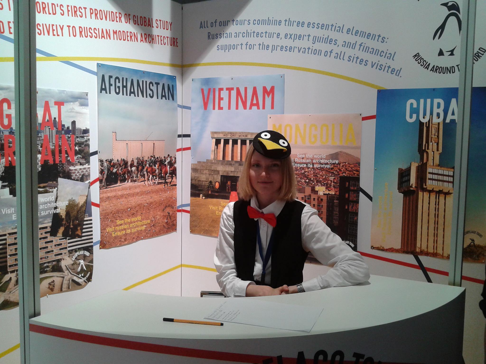 Back at the Russian Pavilion, there’s a booth for a “business” named Archipelago Tours, a travel agency specializing in tours of Russian-designed architecture around the world. It is appropriately decorated with a handful of travel posters enticing us to visit places such as Afghanistan, Vietnam, and even Great Britain.