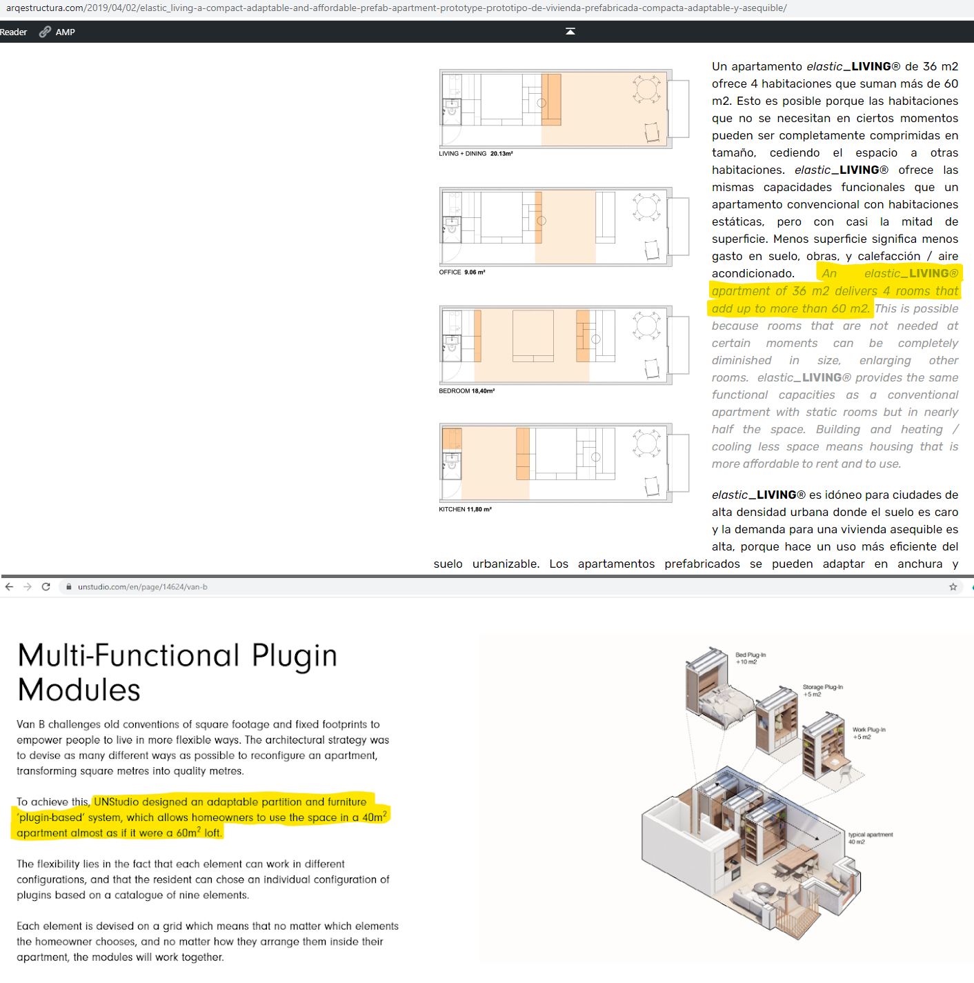 In our competition entry we wrote: “An elastic_LIVING® apartment of 36 m2 delivers 4 rooms that add up to more than 60 m2”. Compare that with UNStudio’s recent post: “UNStudio designed an adaptable partition and furniture ‘plugin-based’ system, which allows homeowners to use the space in a 40m2 apartment almost as if it were a 60m2 loft.”