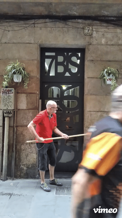 A few years ago, dozens of residents of a street in Barcelona’s El Raval neighborhood started hanging potted plants from their building facades, radically changing the street’s appearance for the better. It was not part of any official policy, but rather a spontaneous “grassroots” initiative that has since expanded to other streets. Flower pots, mostly containing spider plants, are held up by brackets fixed to exterior walls over 2 meters off the ground, where they do not cause obstruction. Watering cans on the ends of long poles are used to irrigate the plants.