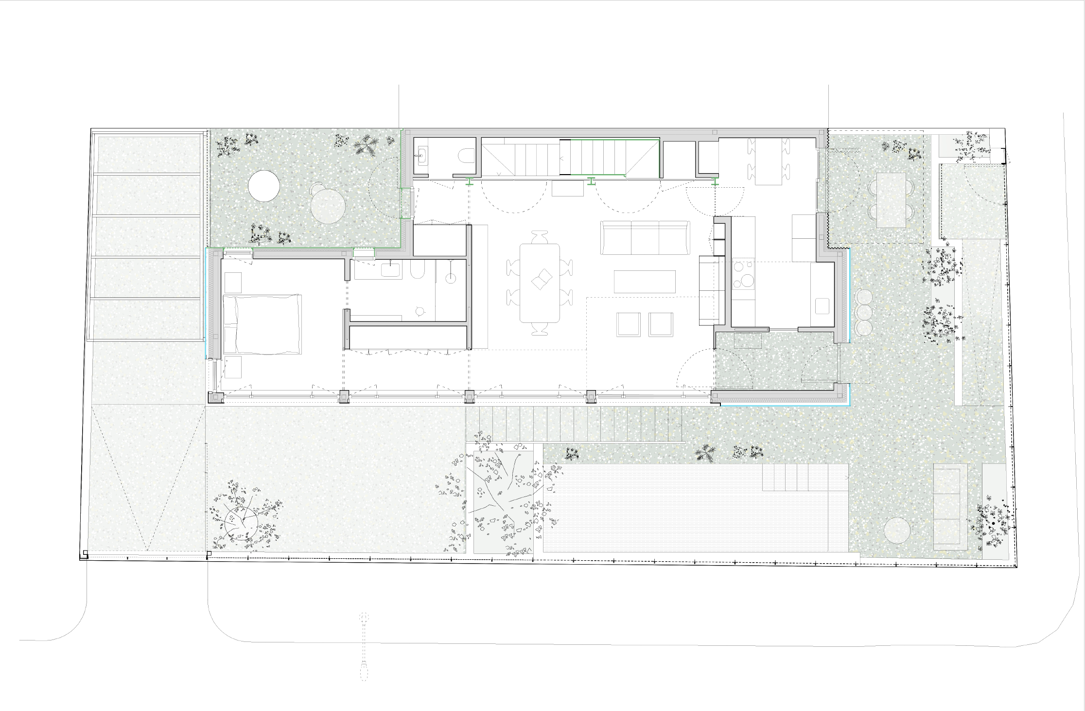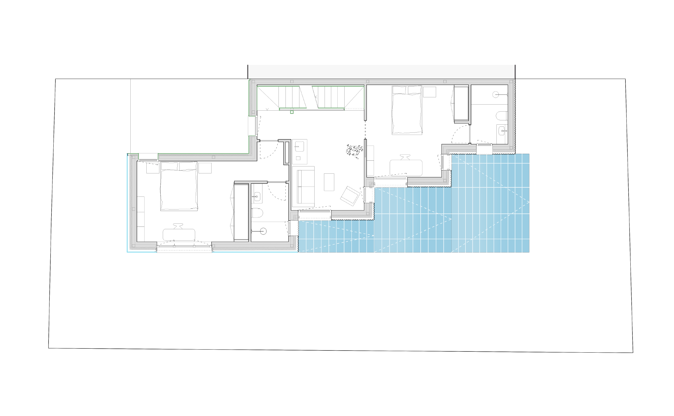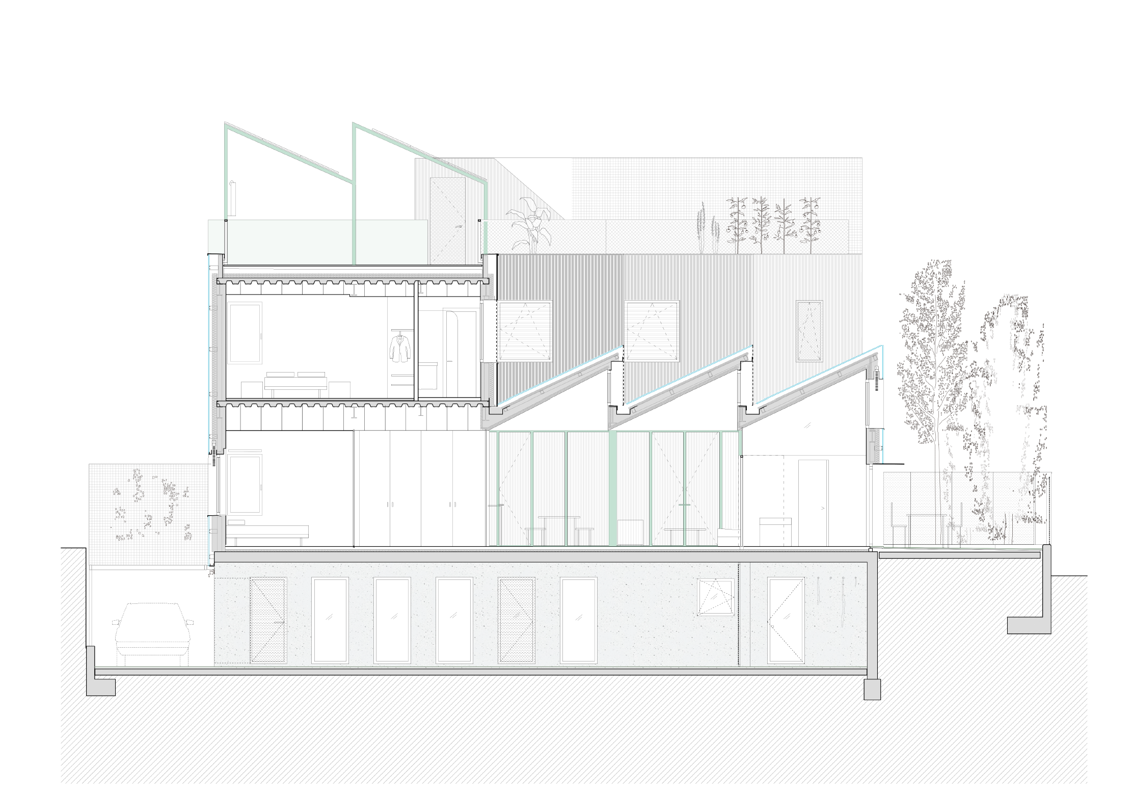 From the living-dining room, a pair of polycarbonate doors lead to a pair of stacked single-run stairways separating this space from the party-wall of the house. One stair descends to the independent flat as well as to mechanical spaces below, while another ascends to the lounge of an upper-floor guest suite consisting of a lounge flanked by a pair of bedrooms for visiting friends or relatives to stay in. The guest suite is articulated around the sawtooth roof of the living-dining room below, creating corners with windows orientated in different directions. The stairway then continues up one more flight to the roof terrace. Here, the rooftop photovoltaic pergola (in conjunction with a battery) supplies 80% of the power consumed by the house, which uses an air-source heat pump in conjunction with in-floor radiant heating and cooling. Natural cooling through ventilation is also achieved by means of a mechanical north-facing vent operated by thermal sensors that transform the stairwell into a thermal chimney.