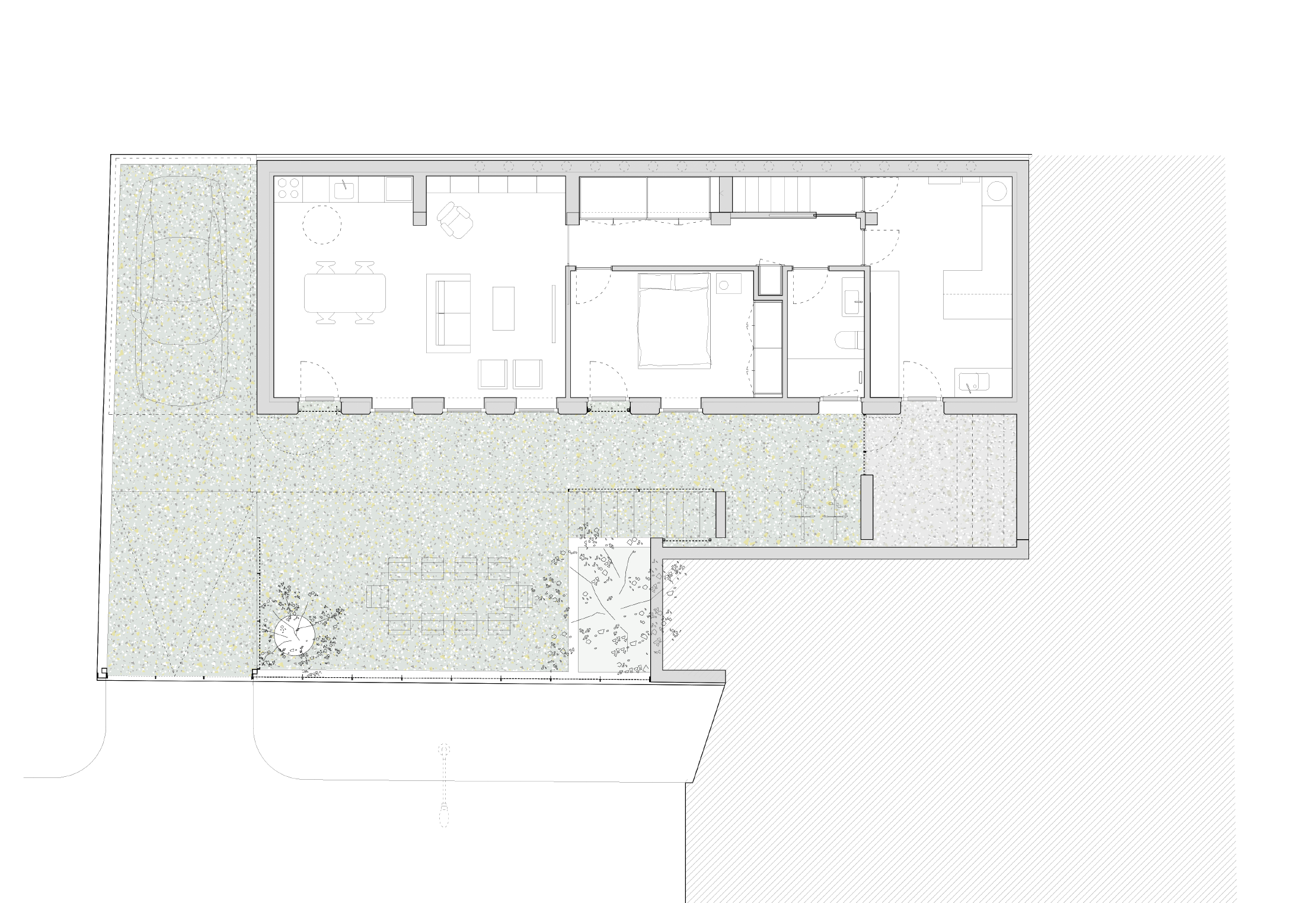 Beyond-the-Family Kin House only has one outdoor parking space at the rear that moreover doubles as extra patio space in the absence of a car. This omission of a garage, a regular fixture of suburbia, as well as its situation on a corner site permits this closer and more intimate relationship between inside and outside. The integration of the architecture with the sloping terrain is moreover exquisitely handled, demonstrating a firm grasp of ‘ground control.’