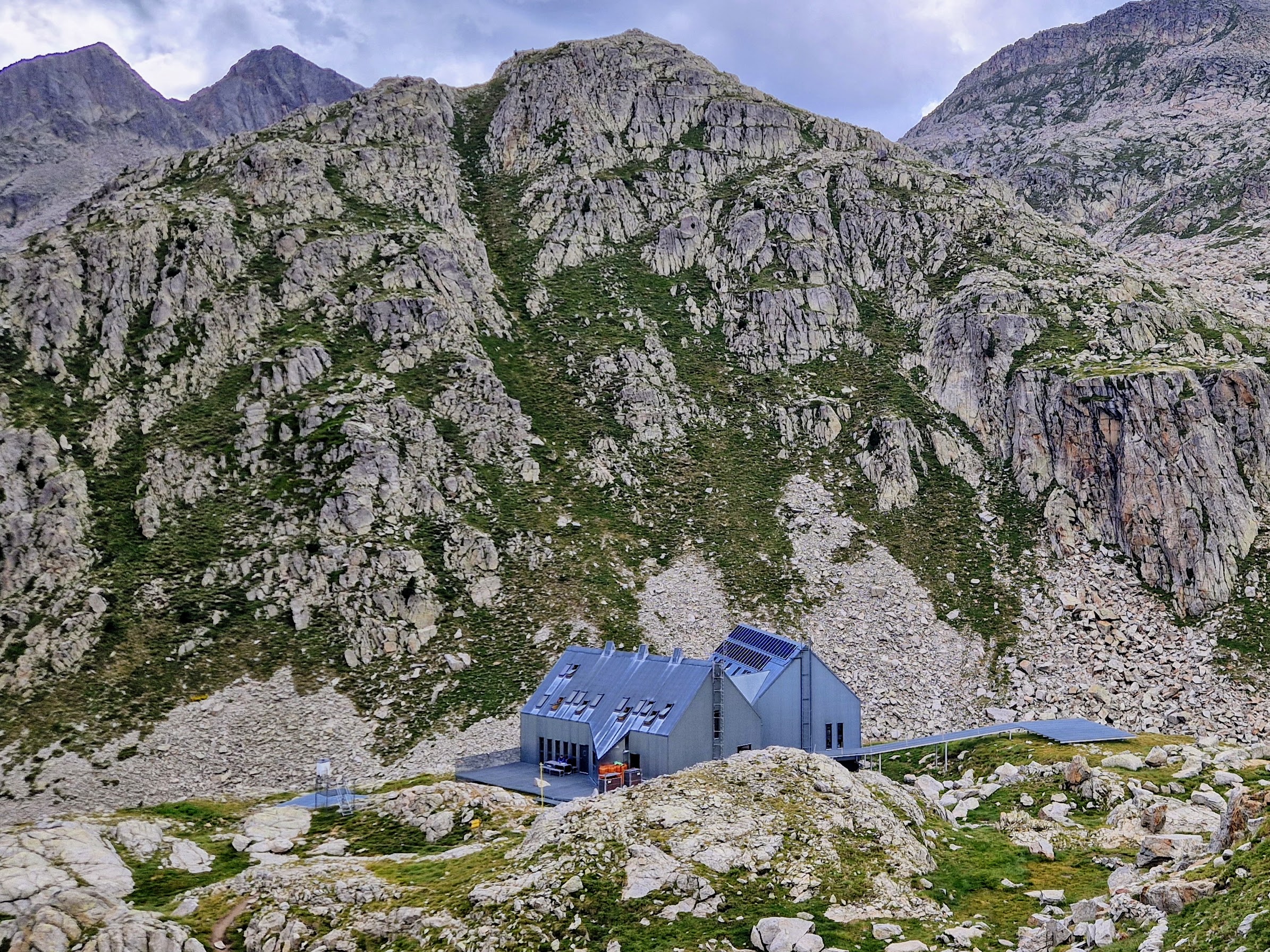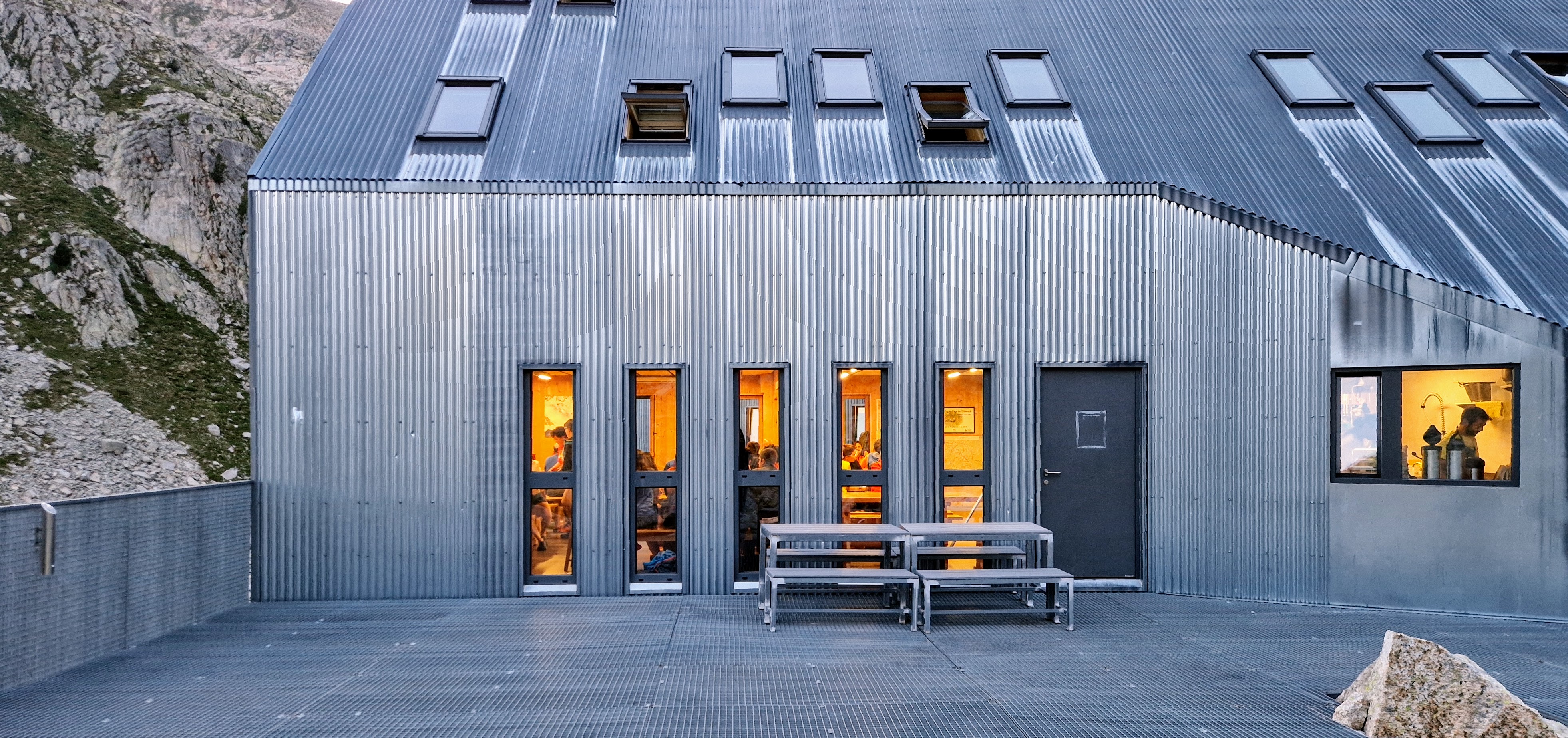 Mountain huts, when situated far from any infrastructure such as a road or a ski lift, cannot afford to be architecturally gratuitous. They must make the most intelligent use of space and materials, and they must perform as efficiently as possible. The Cap de Llauset mountain hut, designed by architects Alejandro Royo and Ramon Solana for the Aragonese Mountain Federation, is situated along the hiking trail GR 11 that traverses the entire Pyrenees mountain range. It is located at 2425m altitude near Mount Aneto, the Pyrenees’ highest peak at 3404m. Its comfort is basic: sleeping is in dormitory bunk beds; eating in a dining room with shared tables. While this may not meet with the common definition of “luxury,” believe me: after a gruelling hike over the 2812m Salenques pass, there is no greater luxury than being able to take a warm shower and being served a hot bowl of lentils at such a convenient location.