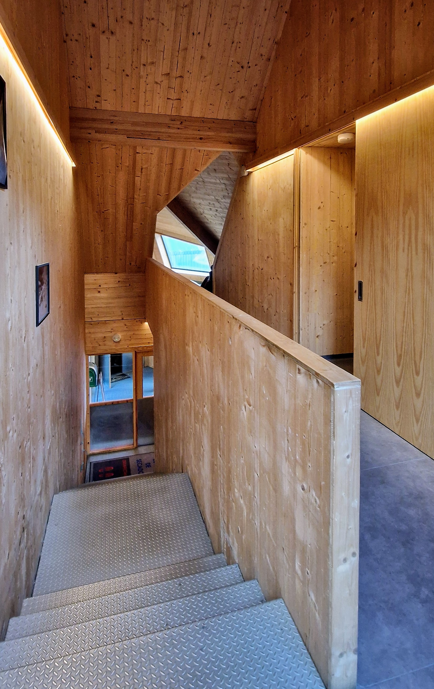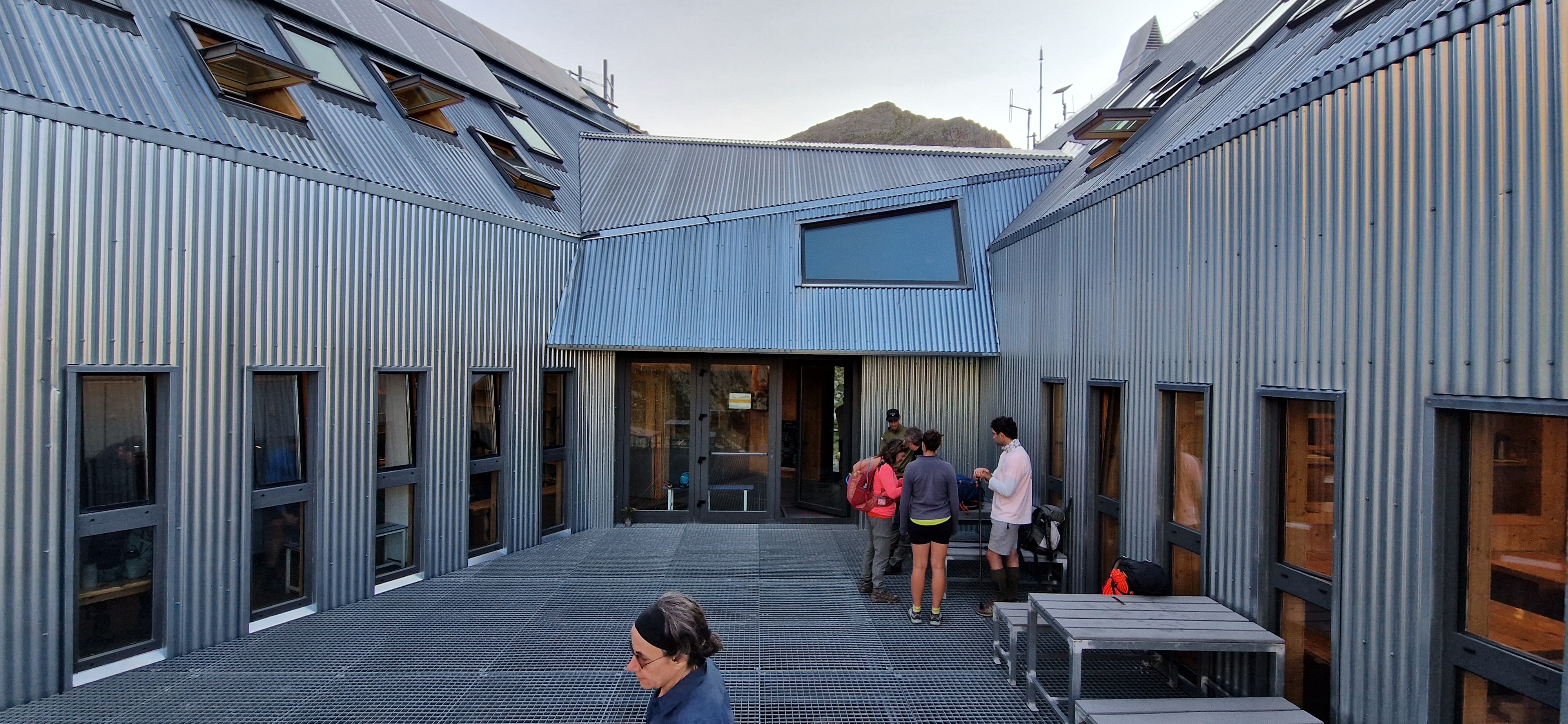 Completed in 2018, the mountain hut consists essentially of two gabled buildings that fan out from a lower connecting volume to create a protected outdoor space. The main floor of the facility contains the more public functions –entry foyer, locker room, check-in counter, kitchen, dining room– while the upper level consists mostly of six-person dormitories with their own bathrooms (a step up from older huts). Constructed of cross-laminated timber (CLT) and glulam left entirely exposed on the interior, the structure is clad on the exterior with galvanized corrugated sheet steel on both walls and roof, creating a tough aesthetic that is consistent with the tough climate and topography.
