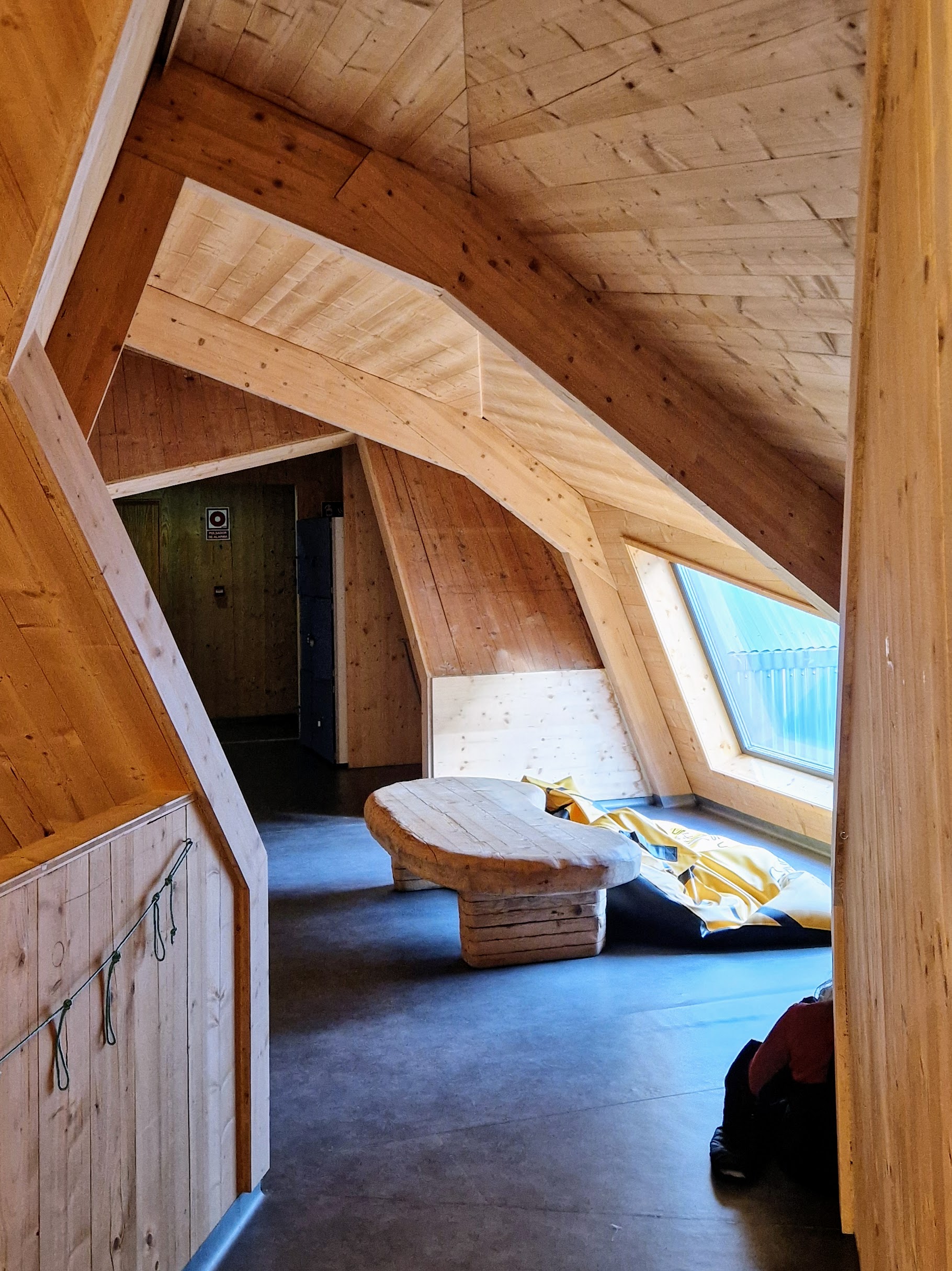 The two main buildings are straightforward gabled volumes, but the small connecting volume has a different roof profile that is moreover asymmetrical. This results in some very intriguing roof intersections over a chill-out lounge with bean-bag seating. The rest of the spaces of this mountain hut are all very regular and efficient; but this small lounge is an architectural exception. In a remote and difficult environment such as this, just a tiny bit of architectural delight goes a long way.