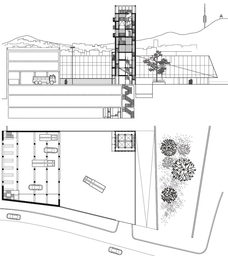 The tower is a free-standing, nine-story high raw concrete and brick structure. It is situated at a corner of the fire station’s grounds, directly across a forecourt from the firefighters’ quarters and garage. One of the tower’s edges abuts the terrain of a large municipal market, from which it is separated only by a narrow sunken laneway, while the other edge borders a ramp that descends to a vast underground parking garage situated beneath both the fire station forecourt as well as the market facility. By virtue of its proximity to its neighbor, the tower appears –architecturally– to belong to the municipal market more than to the fire station, effectively signaling this highly frequented public facility from afar. The only thing missing: a large clock at the very top.