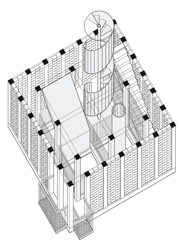 As an architectural simulation of Barcelona’s modern vernacular, the tower is a sort of microcosm of the city. Indeed, at the risk of heightening the metaphor, it can be seen as an axis mundi. However, since the tower also extends below ground, where it contains an emergency exit stair for the underground parking garage, it represents a reverse axis mundi; one where hellfire and danger occur above the heavenly bliss of an egress stair designed for fire safety.