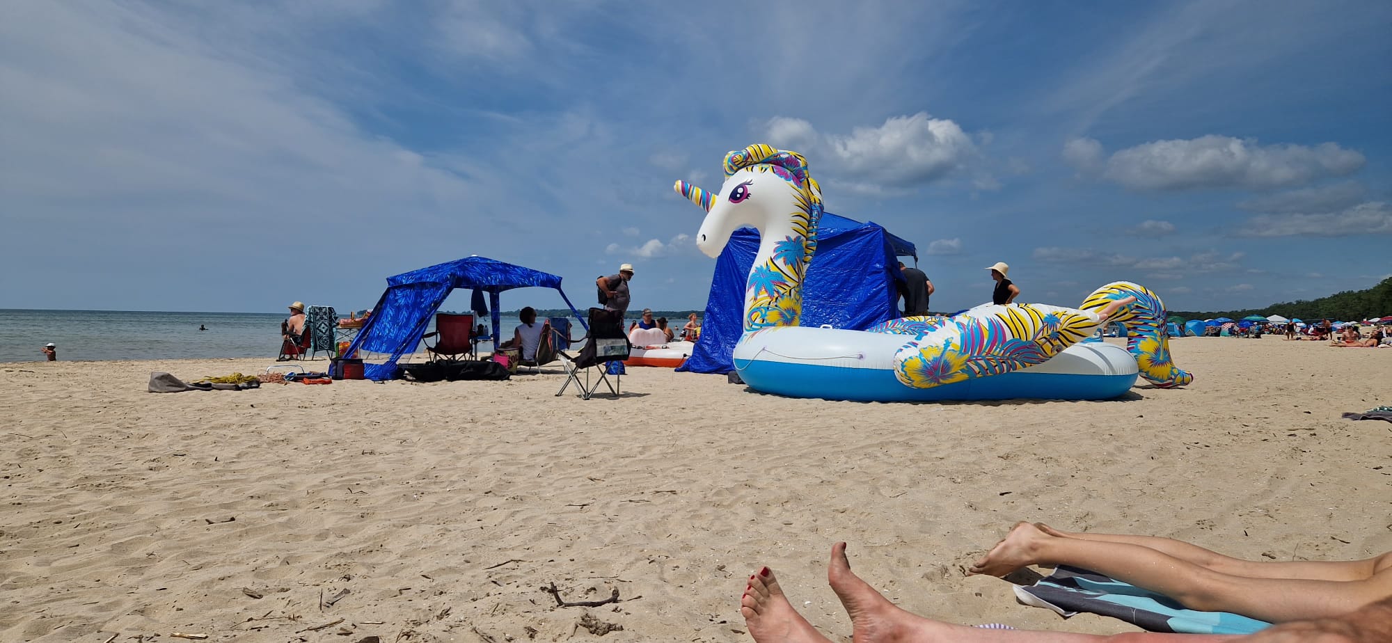 On another trip to Canada, we once witnessed a surreal scene associated with stuff. We were at the Sandbanks Provincial Park beach on Lake Ontario, seated on towels and reading, when a group of about a dozen people showed up to enjoy a day at the beach. Instead of beach towels, they brought along folding chairs and set those up. Then they left and returned with a few foldable tables, a portable gas barbecue, several coolers, and two portable shade canopies. But that was still not all. They left again and came back with a heavy-duty portable sound system as well as a gigantic inflateable unicorn for them all to sit on in the water. To transport all those things, at least three full-size pickup trucks must have been used. Here we were, sitting on beach towels with only a water bottle, sunscreen, and a book; not even a parasol. It took the group more an hour and a half just to set up their compound of stuff. When they finally finished, and started blasting their sound system, it took us only one minute to pack up and move somewhere quieter.