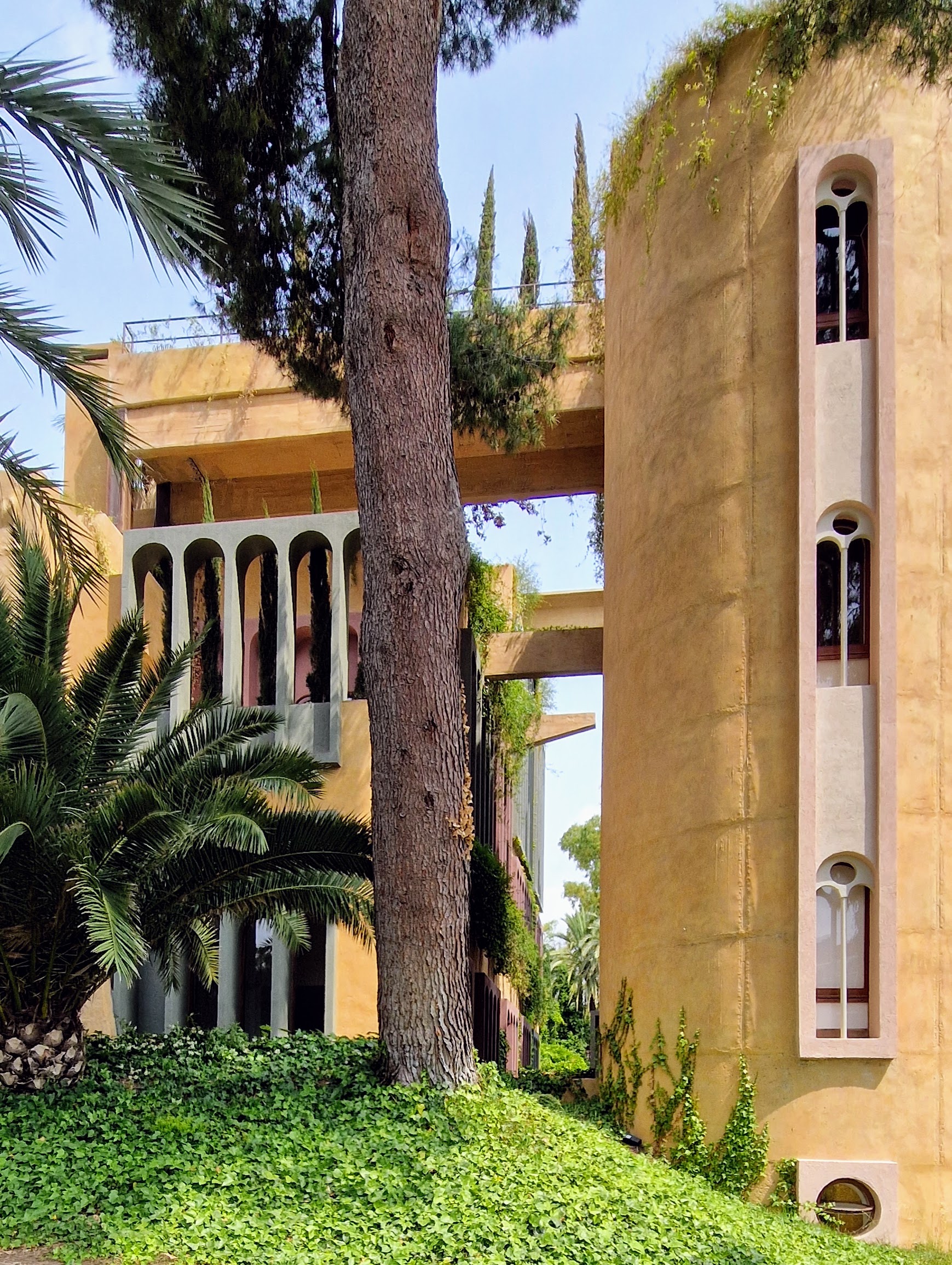 In this context, La Fábrica was intended as an act of resistance, ‘a built manifesto’ in Bofill’s own words. ‘During my first visit, I suddenly thought that something horrible could be transformed into something very beautiful, just as idiocy can sometimes be transformed into genius.’ With its machine halls, 30 concrete silos, 4km of underground tunnels and the then tallest smokestack in Europe, the 1917 LACSA cement factory was slated for (very costly) demolition after production had moved to a new facility, enabling Bofill to acquire the site. In 1973, he began transforming its heavy‑industrial architecture into the veritable monastic complex of workspaces, residences and gardens that it is today – a defiant act of hope and imagination during grey times.