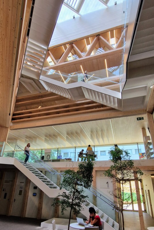 Mass-timber is more flexible than reinforced concrete, so it is perhaps not the ideal material for a building with large glass openings and a mighty cantilever full of heavy books. Bibliotèca Gabriel García Márquez reveals, then, a fundamental mismatch between its beautiful architectural form and its sustainable structural material.