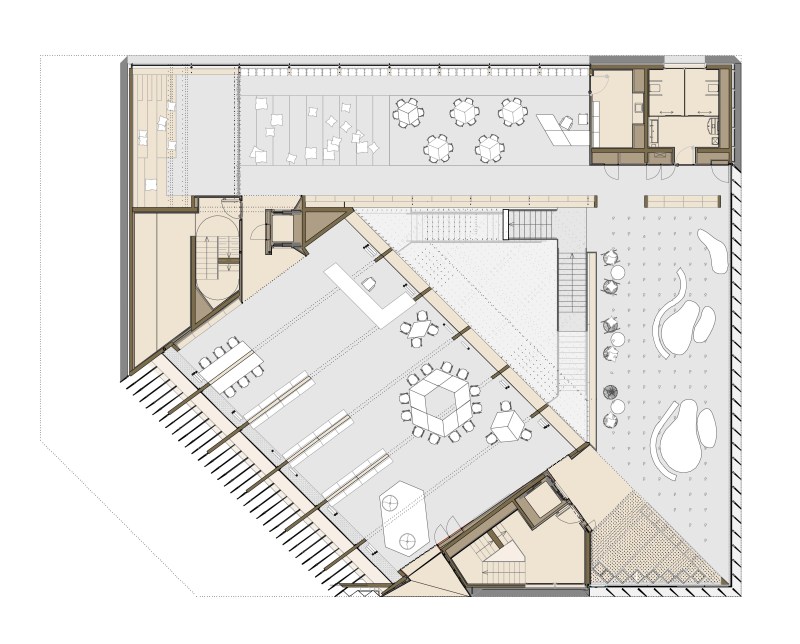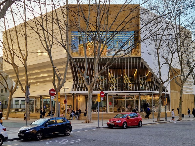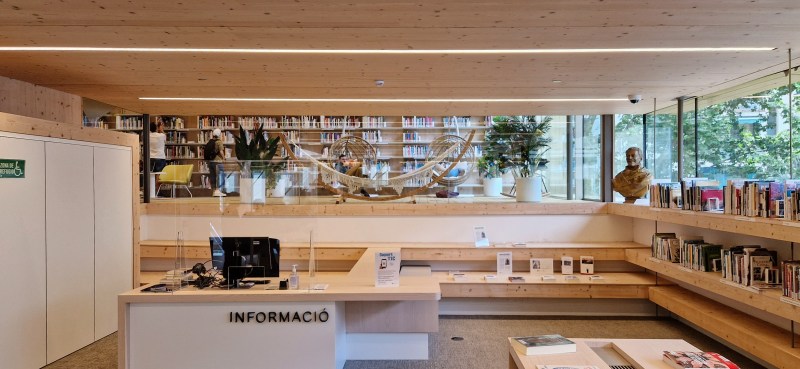 Bibliotèca Gabriel García Marquez is a neighborhood branch of Barcelona’s municipal library system. Situated on a chamfered corner of a typical city block, it is a very sculptural object-building characterized by immense glazed openings and an entire part of the building that is dramatically cantilevered over its entrance area. The library’s spaces step upward around a central skylit atrium in which mass-timber structural elements and connections are exposed throughout, creating a warm daylight-filled interior highly conducive to reading.