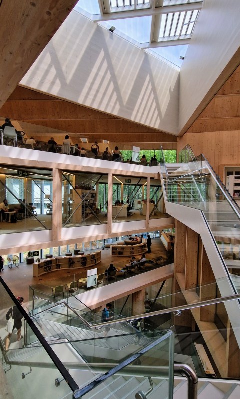 The interior spaces are varied in size and proportion, making for an eventful promenade while offering users plenty of choices in terms of places to work or hang out: there is a low-ceilinged area with children’s books, another area where small groups of teenagers do homework together, a media classroom where elderly people learn information technology, a lounge for reading periodicals, plus many stacks of books. There is something for every age group and social class in this bright and inviting public building.