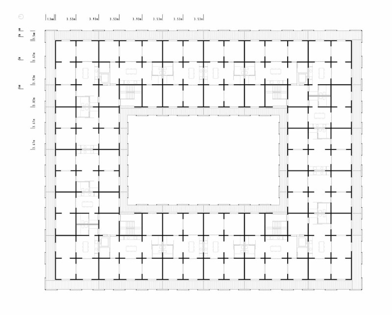 The siting and program of Modulus Matrix were addressed after the design of an optimum structural grid, requiring very creative adaptations and inventions to make the building work. This process resulted in domestic ideas such as centrally situated dining rooms containing kitchens that provide access to similarly-sized generic rooms that can be used in multiple ways. In conjunction with large doors, these enfilades of rooms allow spaces to be joined up or separated; a significant reconfiguration of traditional apartments in which differently sized rooms following a strict functional hierarchy are typically situated along lengthy corridors.